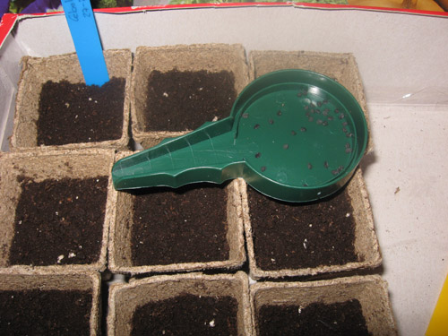 4.- Con cuidado echamos dos o tres semillas en cada lugar. Podéis ayudaros de un sembrador si lo tenéis pero es totalmente factible hacerlo con la mano. Yo uso sembrador porque lo compré por un antojo y queda muy "fashion". Con semillas muy pequeñas es muy difícil coger solo tres, de modo que tocará clarear más adelante si germinan todas.
